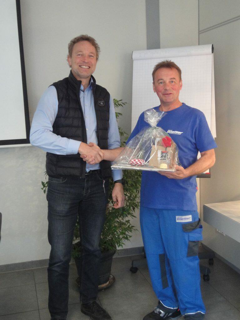 Für 30 Jahre Power und Vollgas überreicht Thomas Gießler Bernhard als Geschenk einen Wellness-Wochenende-Gutschein. Er soll gut für sich selber sorgen. Mitarbeiter wie er sind unser größtes Kapital und Ressource für den Erfolg. Bernhard soll es sich damit gut gehen und sich verwöhnen lassen.